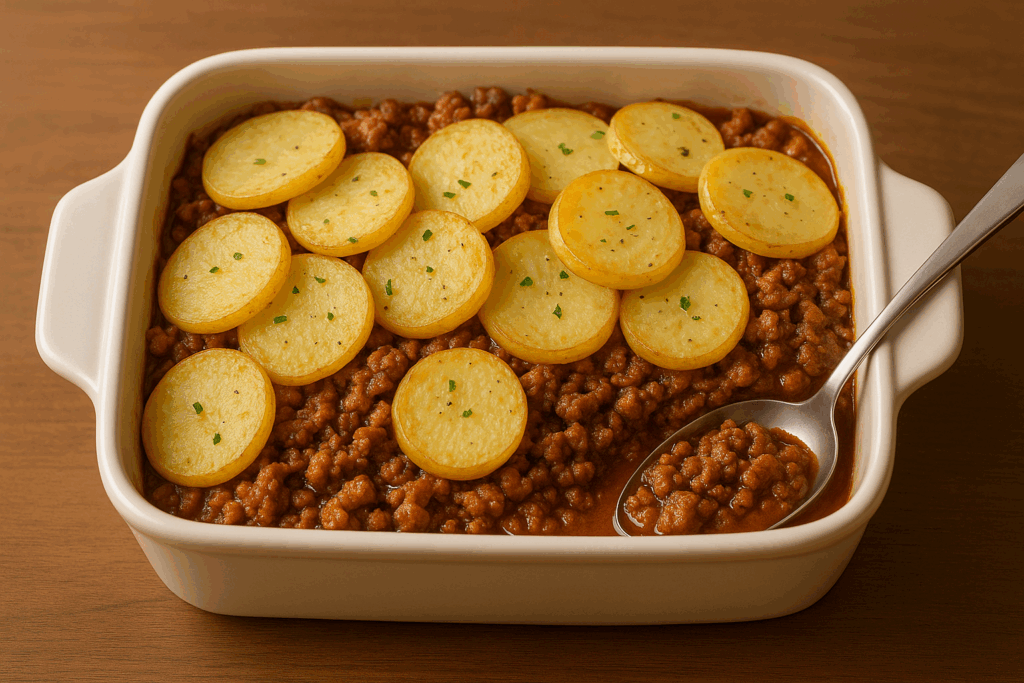 Waarom dit werkt: Door aardappelen voor te koken bespaar je 20 minuten oventijd (energie!). Het gehakt wordt gestrekt door de aardappelen , 300 gram voedt vier mensen. Eieren en melk binden alles en voegen proteïne toe. Dit is een complete maaltijd in één schaal.