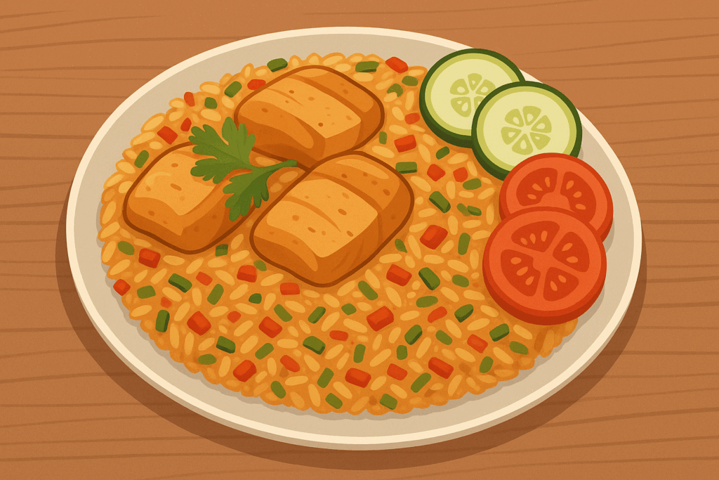 Kook rijst een dag van tevoren (of gebruik restjes rijst , oude rijst werkt beter voor nasi). Snijd kip in kleine blokjes, kruiden met zout en peper. Verhit wok of grote pan met olie, bak kip gaar (6 minuten), haal uit pan. Klop eieren, bak roerei in dezelfde pan, haal eruit. Bak ui en knoflook, voeg diepvries groenten toe (2 minuten), voeg rijst toe en bak onder roeren (3 minuten). Voeg kip, ei, ketjap, sojasaus en sambal toe, roer goed door (2 minuten). Garneer met lente-ui.