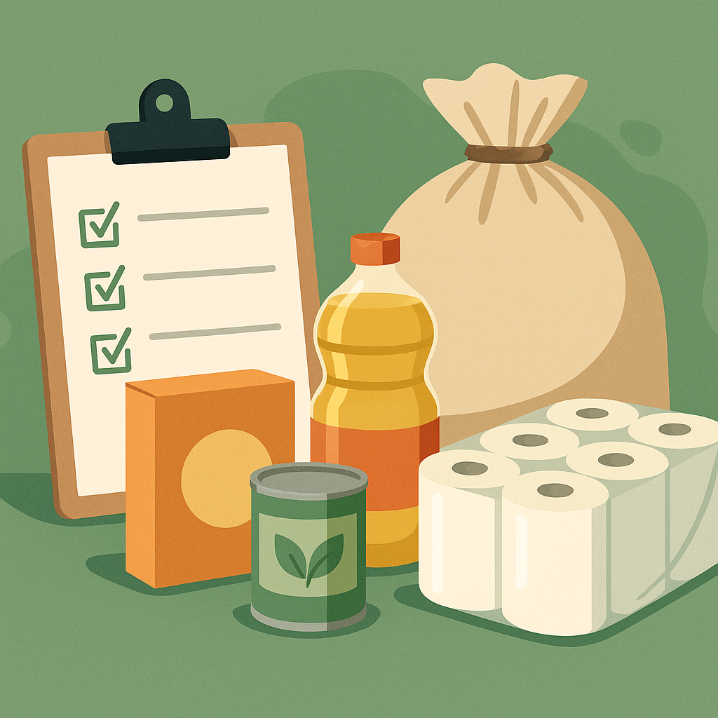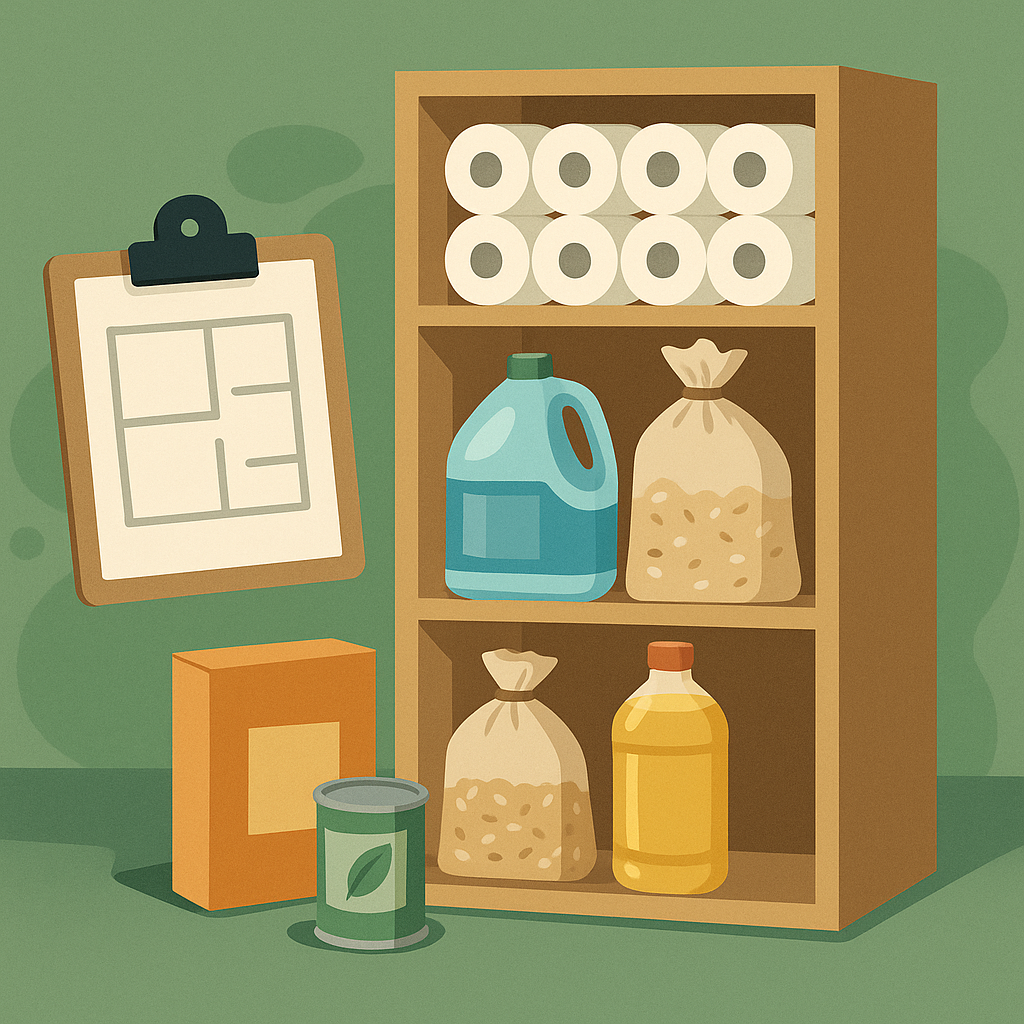Opslag per producttype: Droge voedingsmiddelen in luchtdichte containers (voorkomt ongedierte en houdt vers). Huishoudchemie in originele verpakking maar gegroepeerd (alle schoonmaak bij elkaar). Toiletpapier en papieren producten kunnen gestapeld in hoeken of onder bedden. Conserven in kratjes of dozen (makkelijk te verplaatsen en te tellen).
